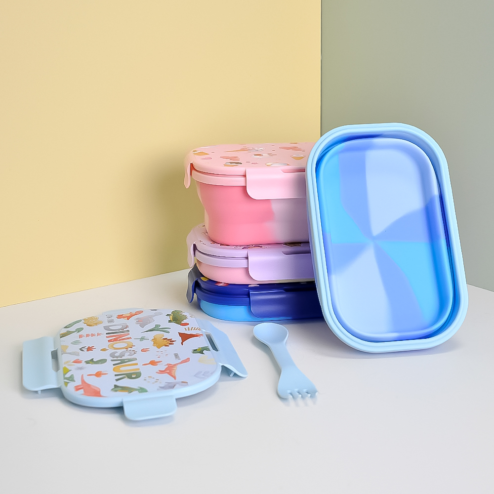 COLLAPSIBLE AND EASY TO CARRY: Press it down and the silicone lunch box folds to 1/3 of its height. It takes up less space than other food containers in your backpack and you can reduce the use of disposable utensils to protect the green environment.